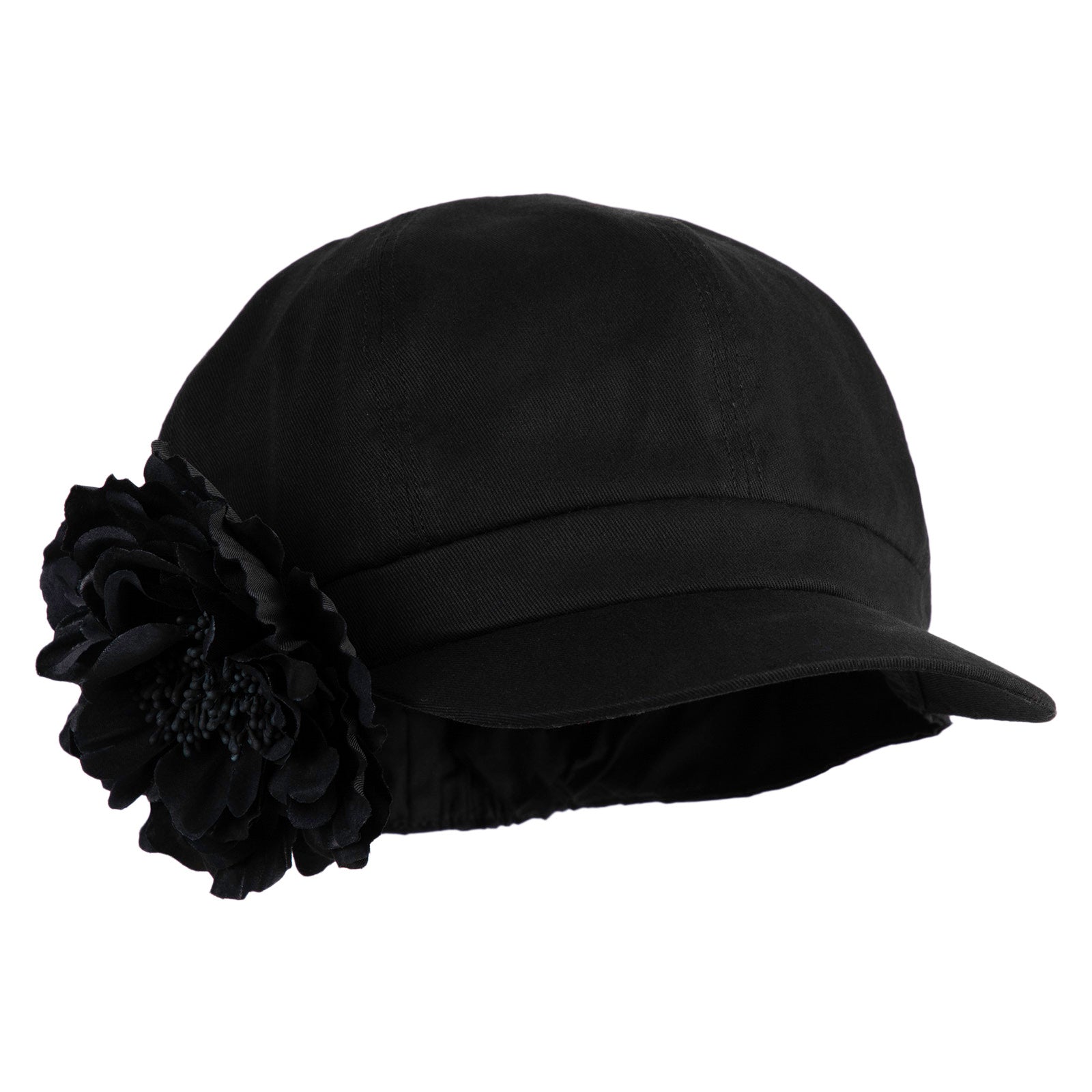 Design, Solid color newsboy hat with flower and rhinestone detail