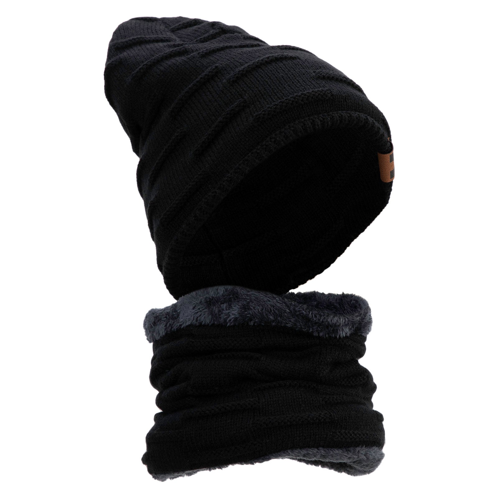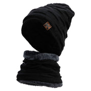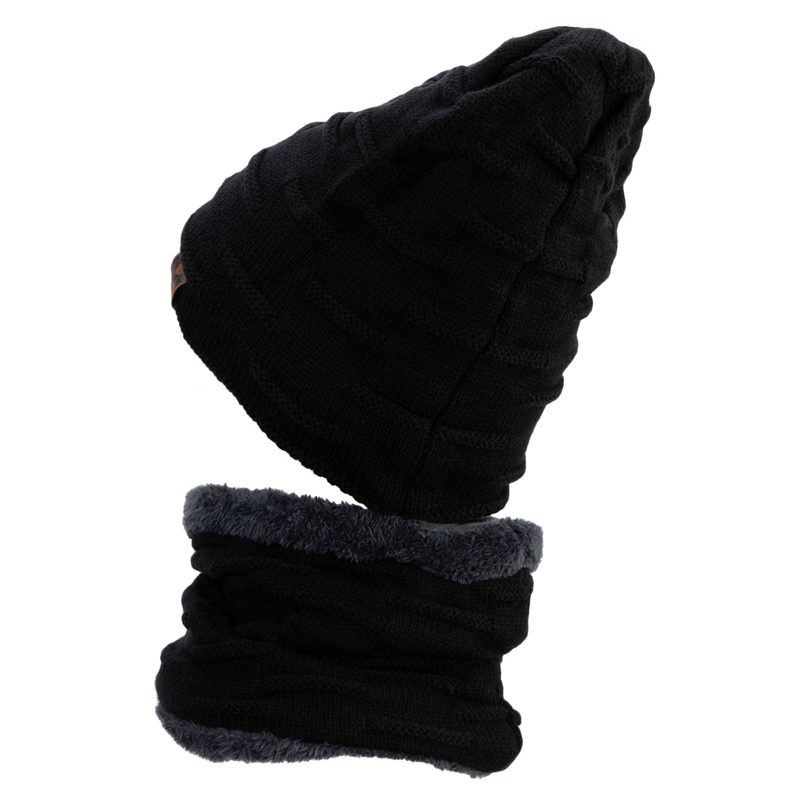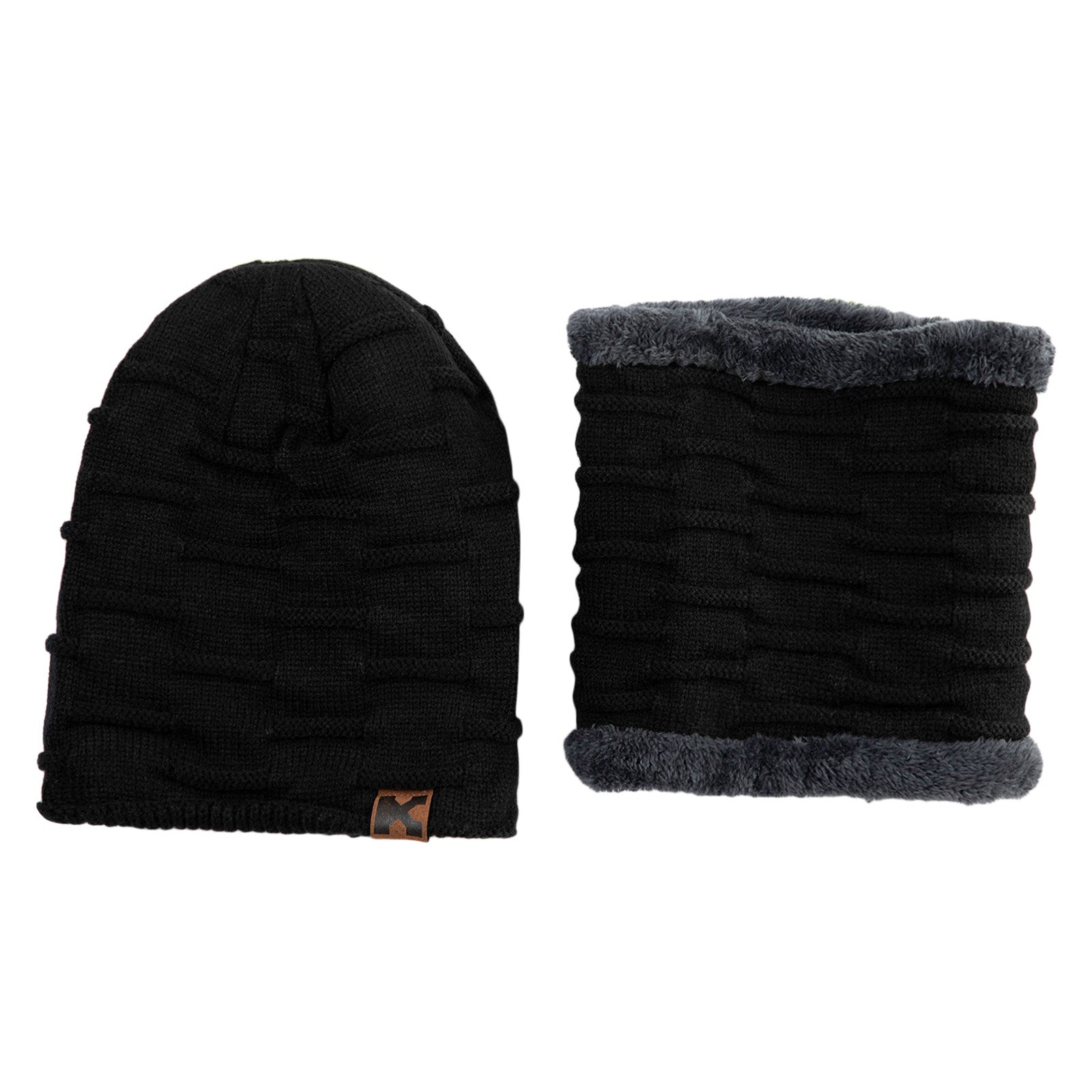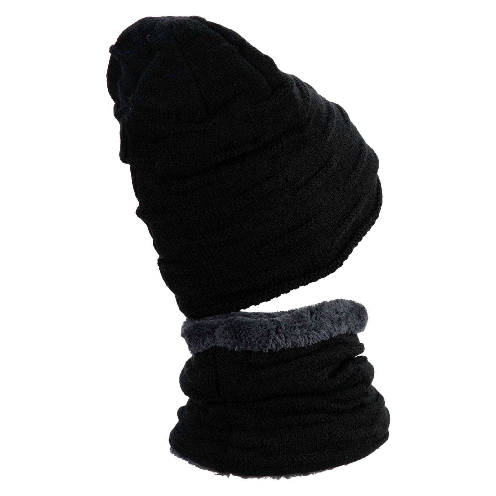 Line Pattern Knit Slouchy Beanie with Neck Warmer - Black OSFM