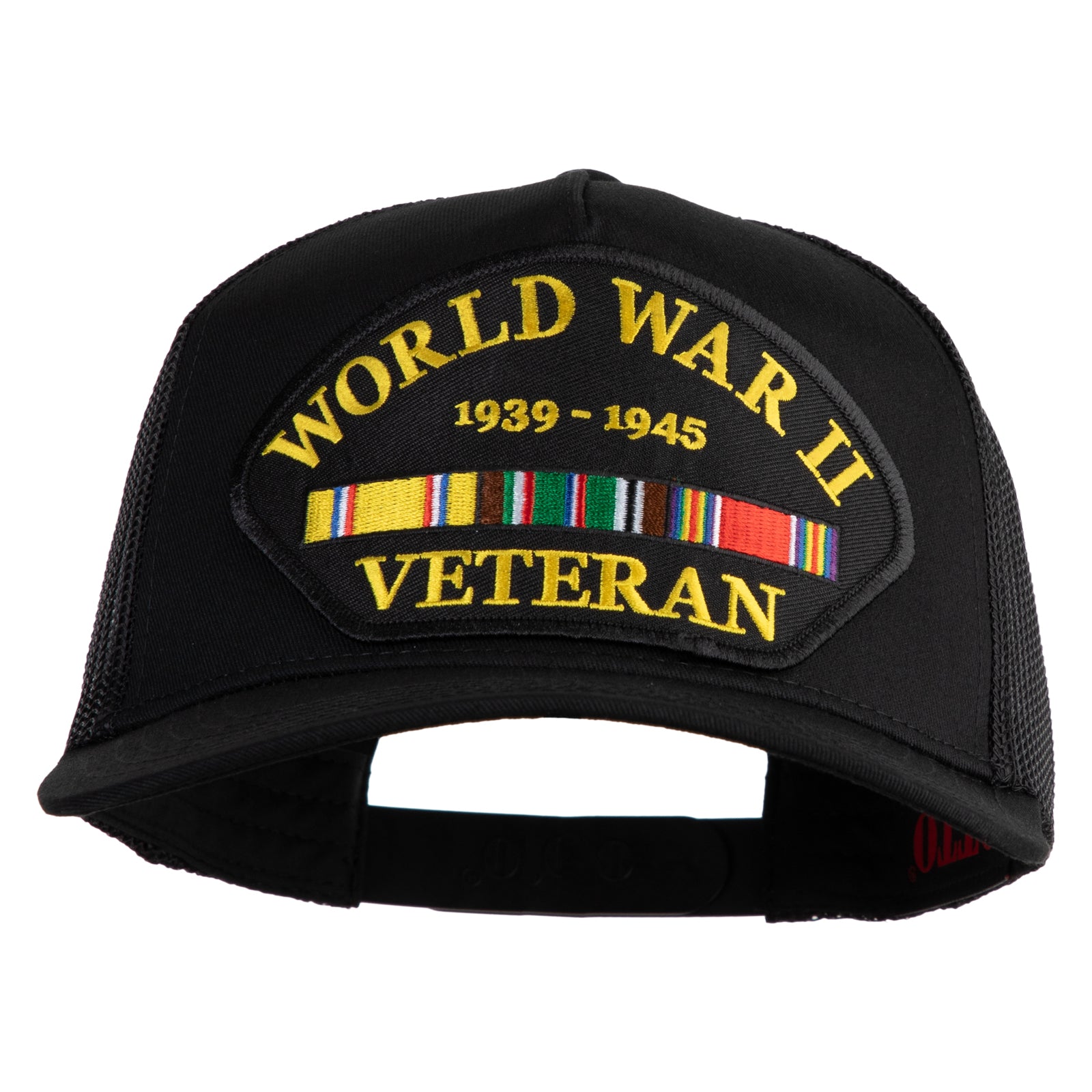 World War II Veteran 1939-1945 Patched Solid Cotton Twill 5 panel Mesh Back Cap - Black OSFM