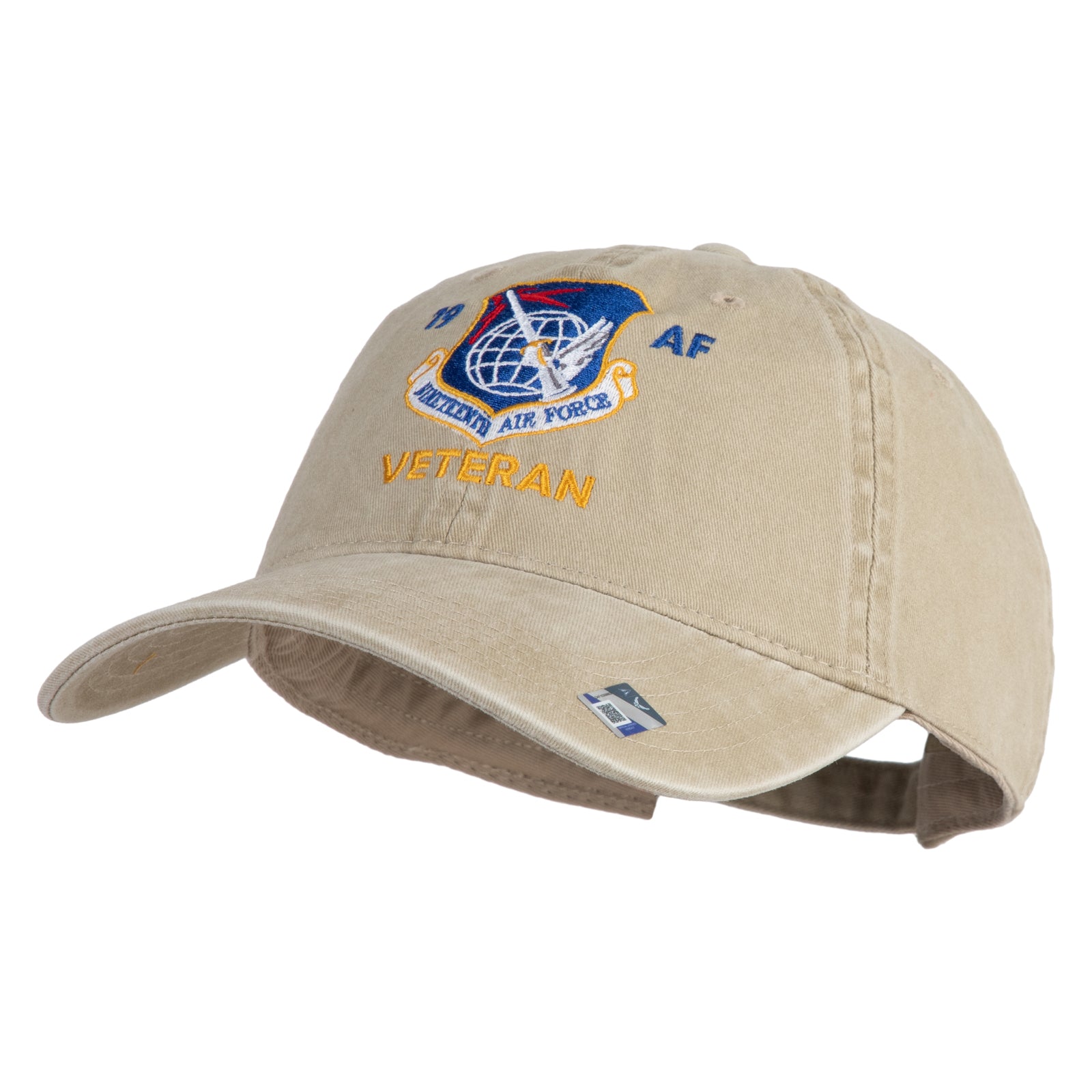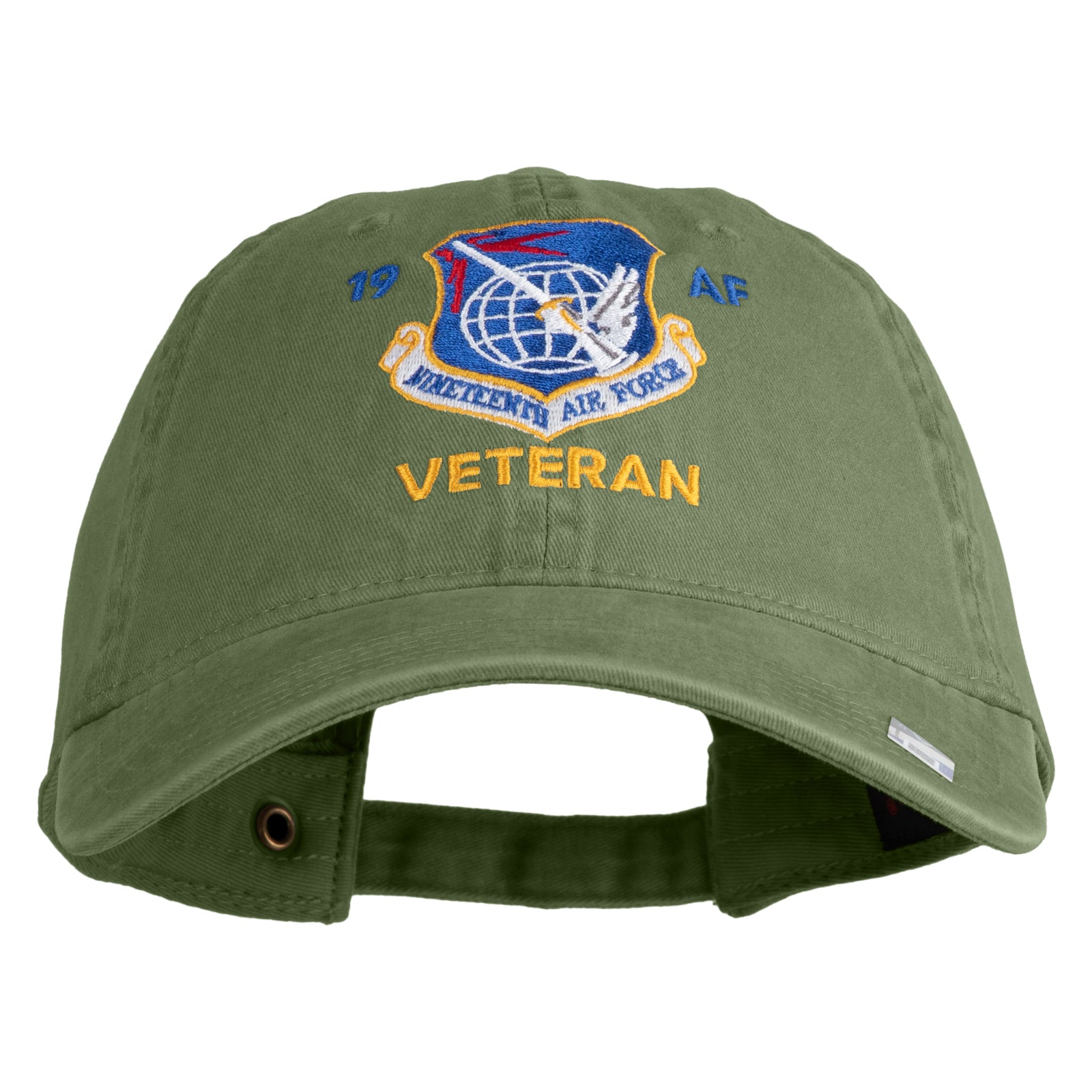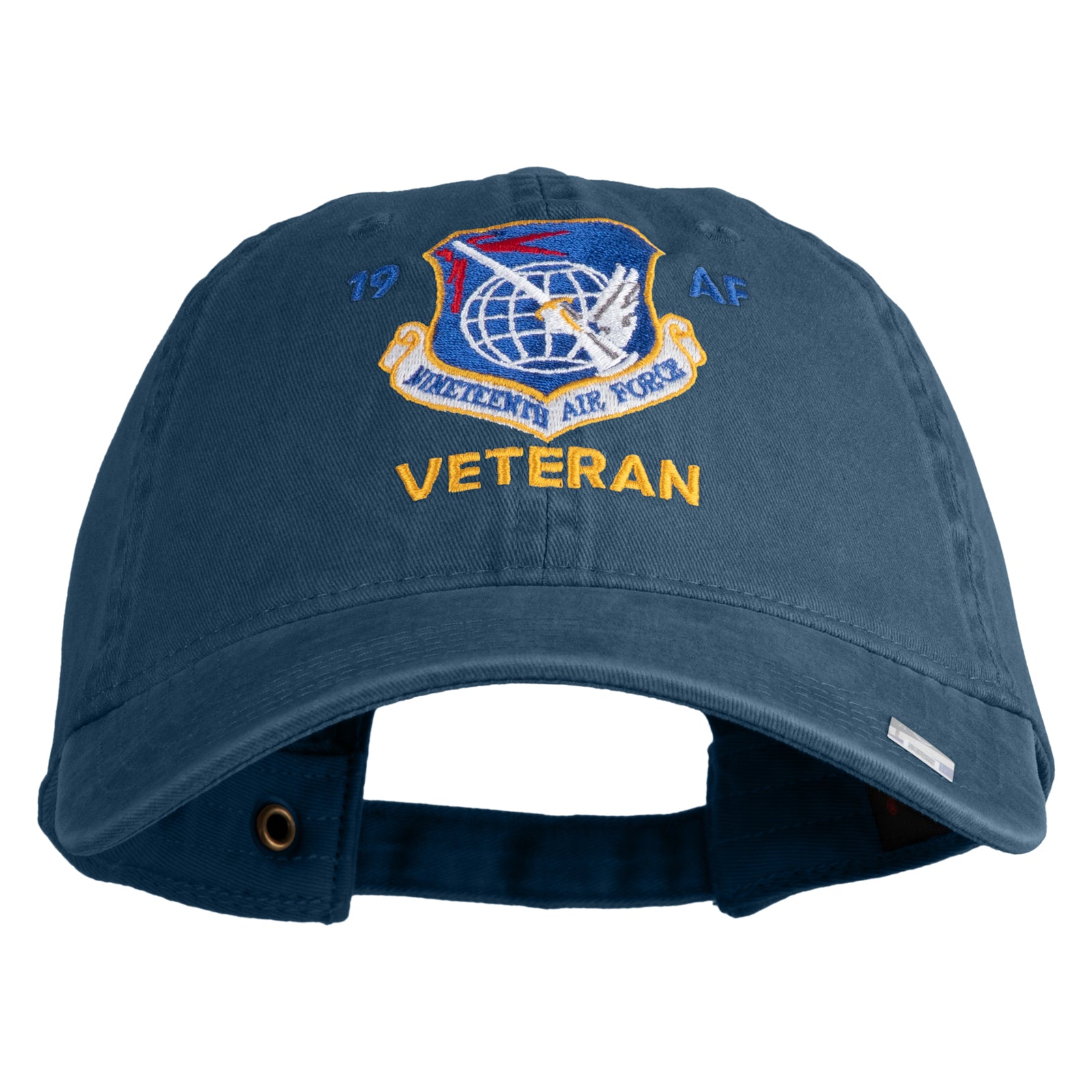 Title, 19 AF Nineteenth Air Force Veteran Embroidered Washed Solid Pigment Dyed Cotton Twill Brass Buckle Cap