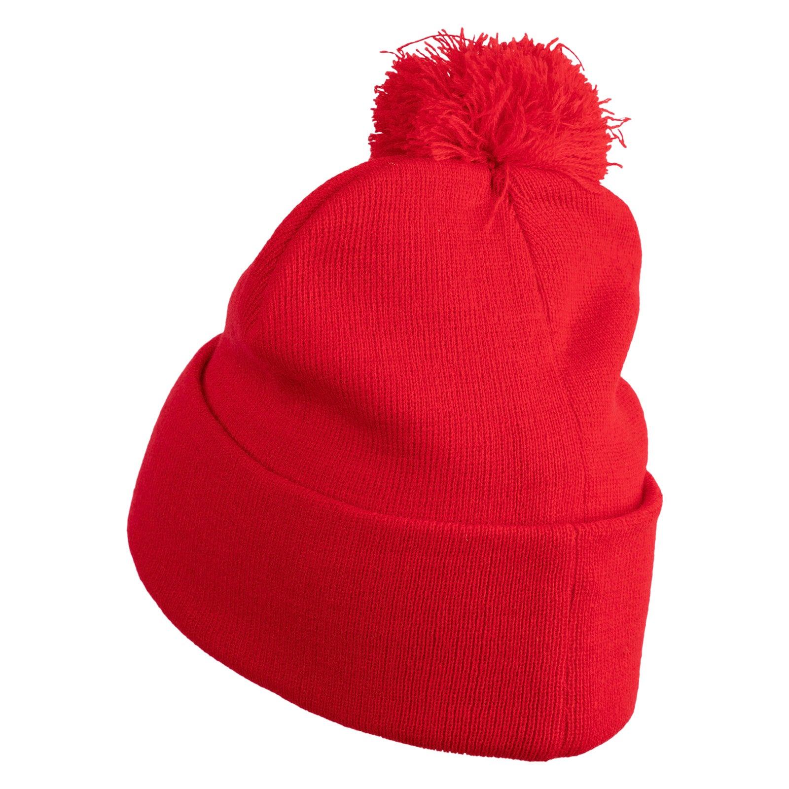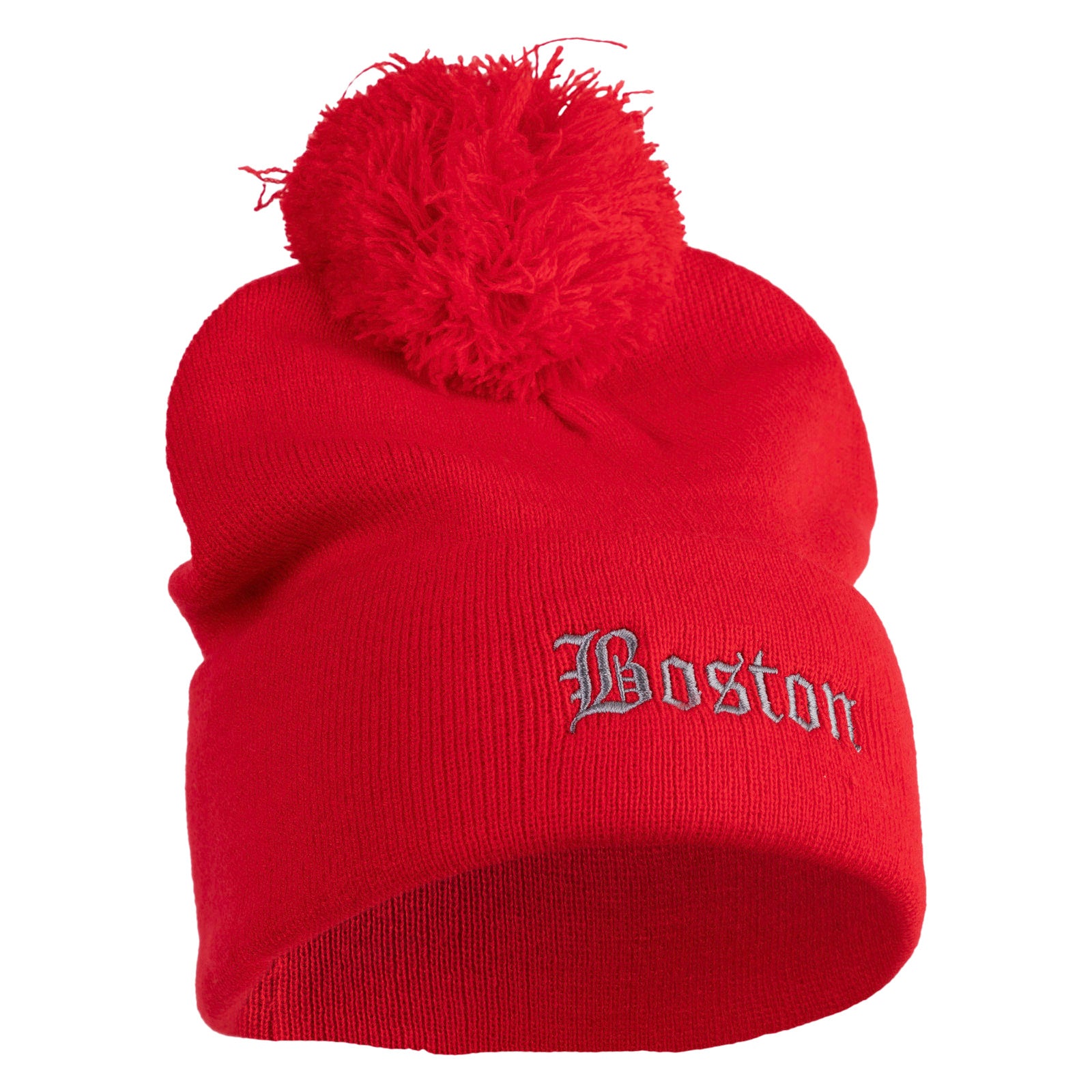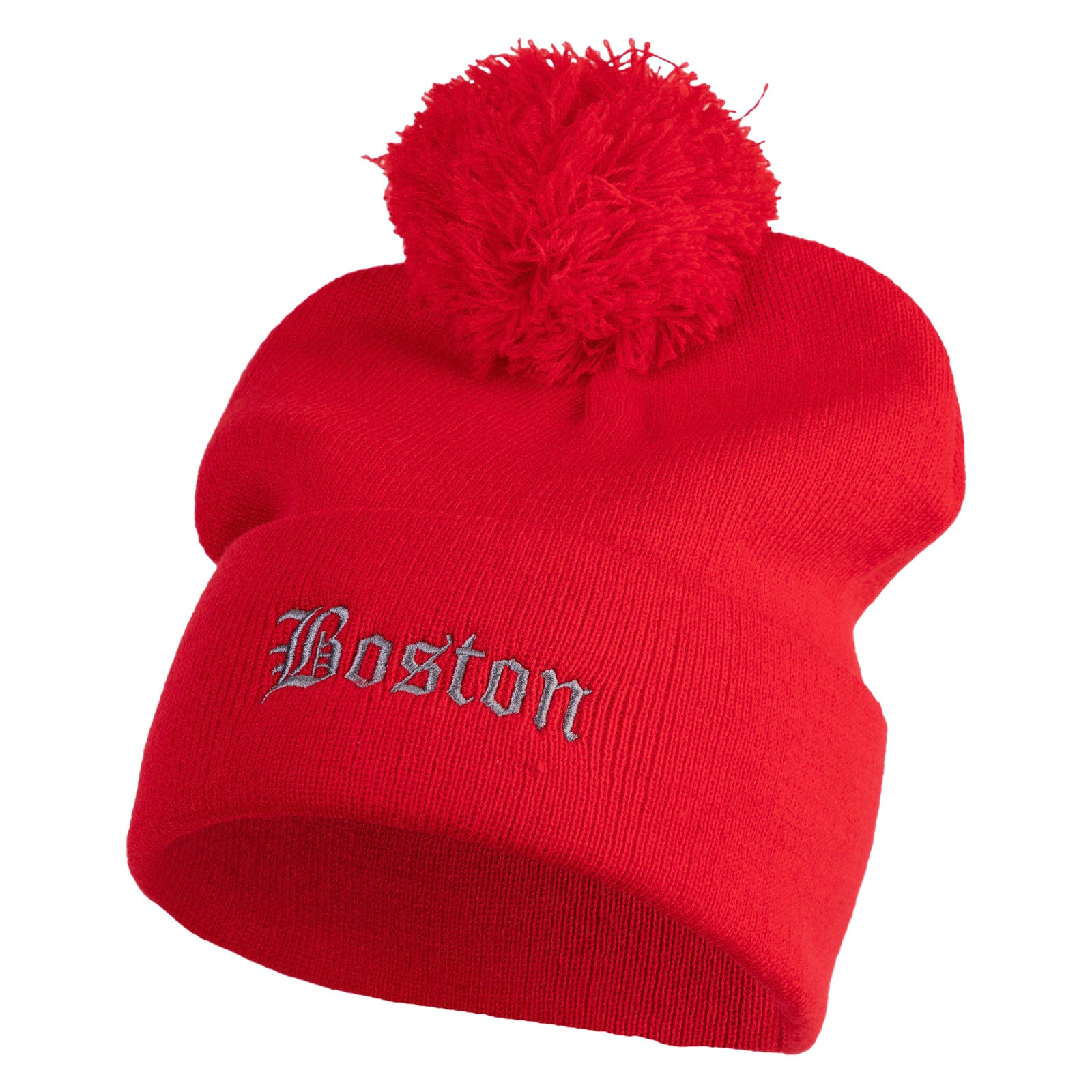 Old English Boston Embroidered Pom Acrylic Cuff Long Beanie - Red OSFM