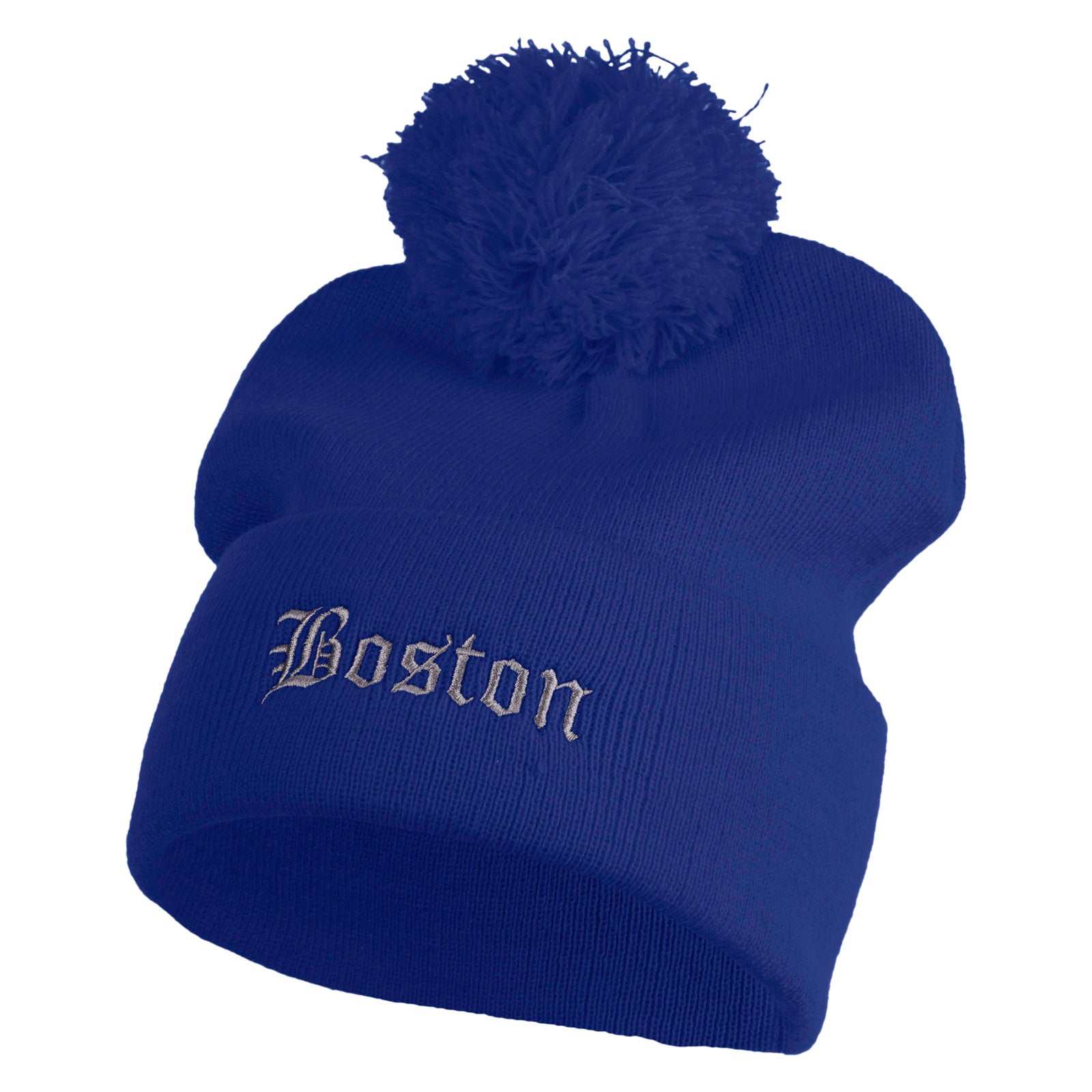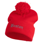 Old English Boston Embroidered Pom Acrylic Cuff Long Beanie