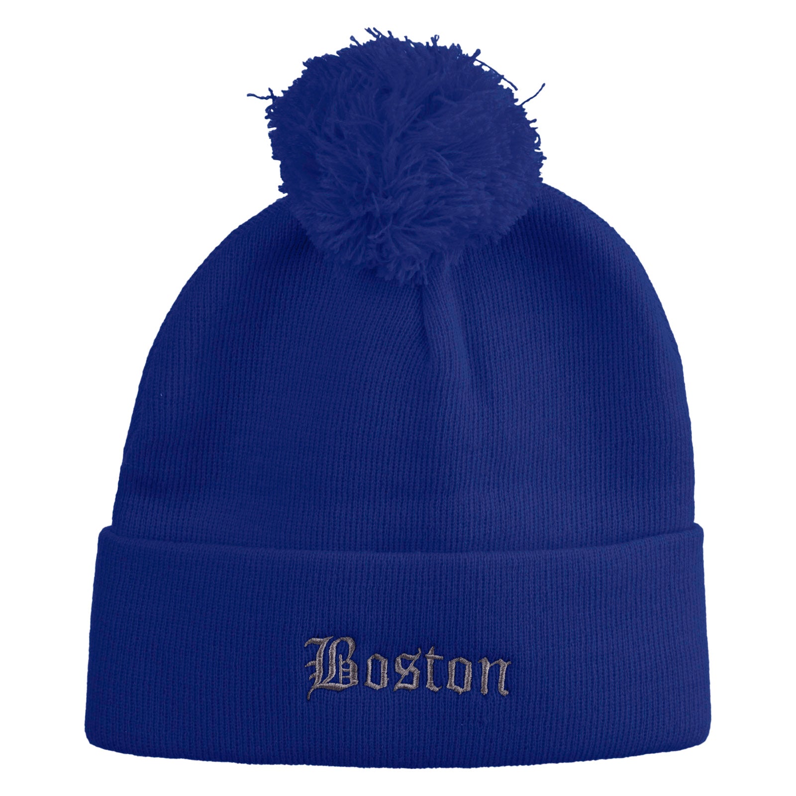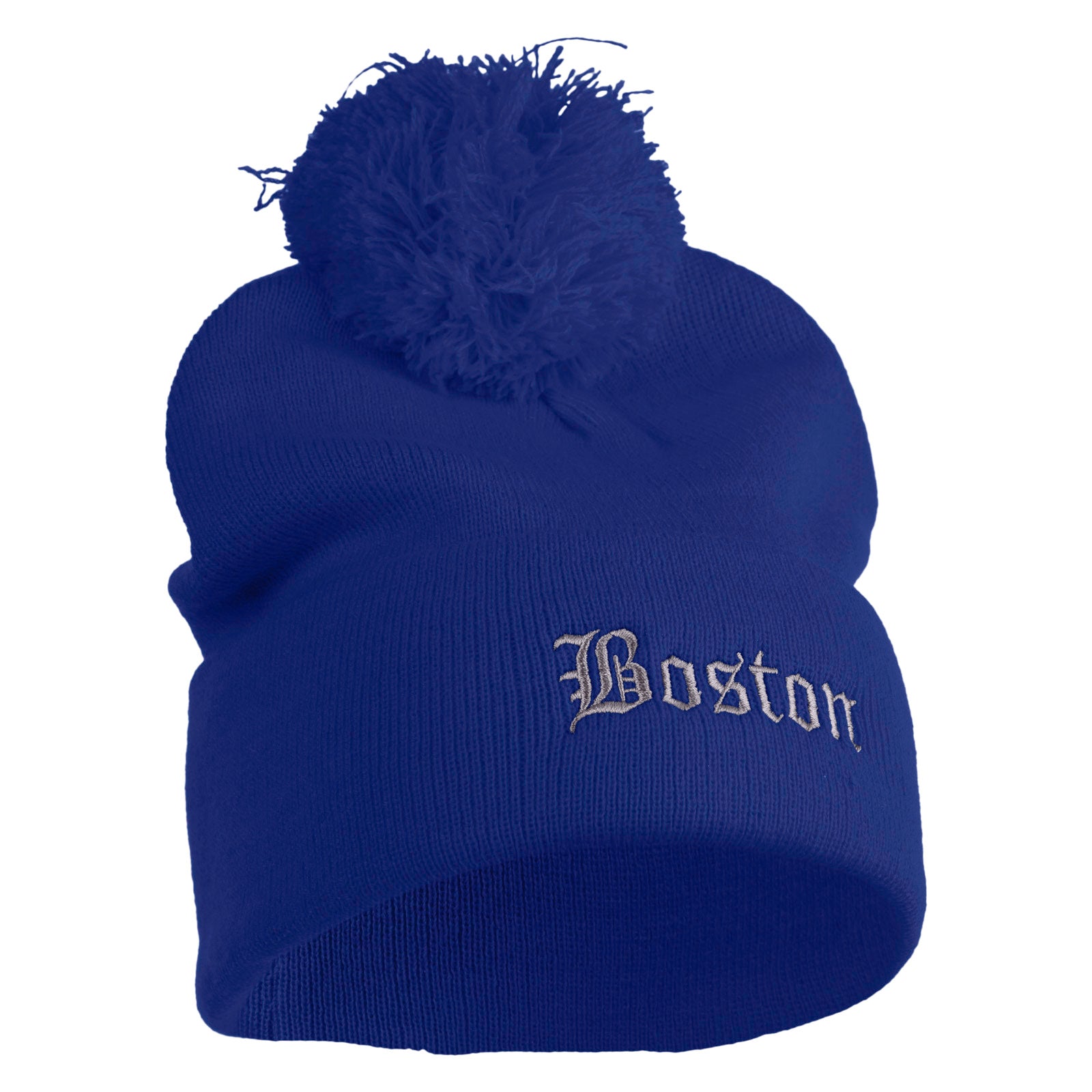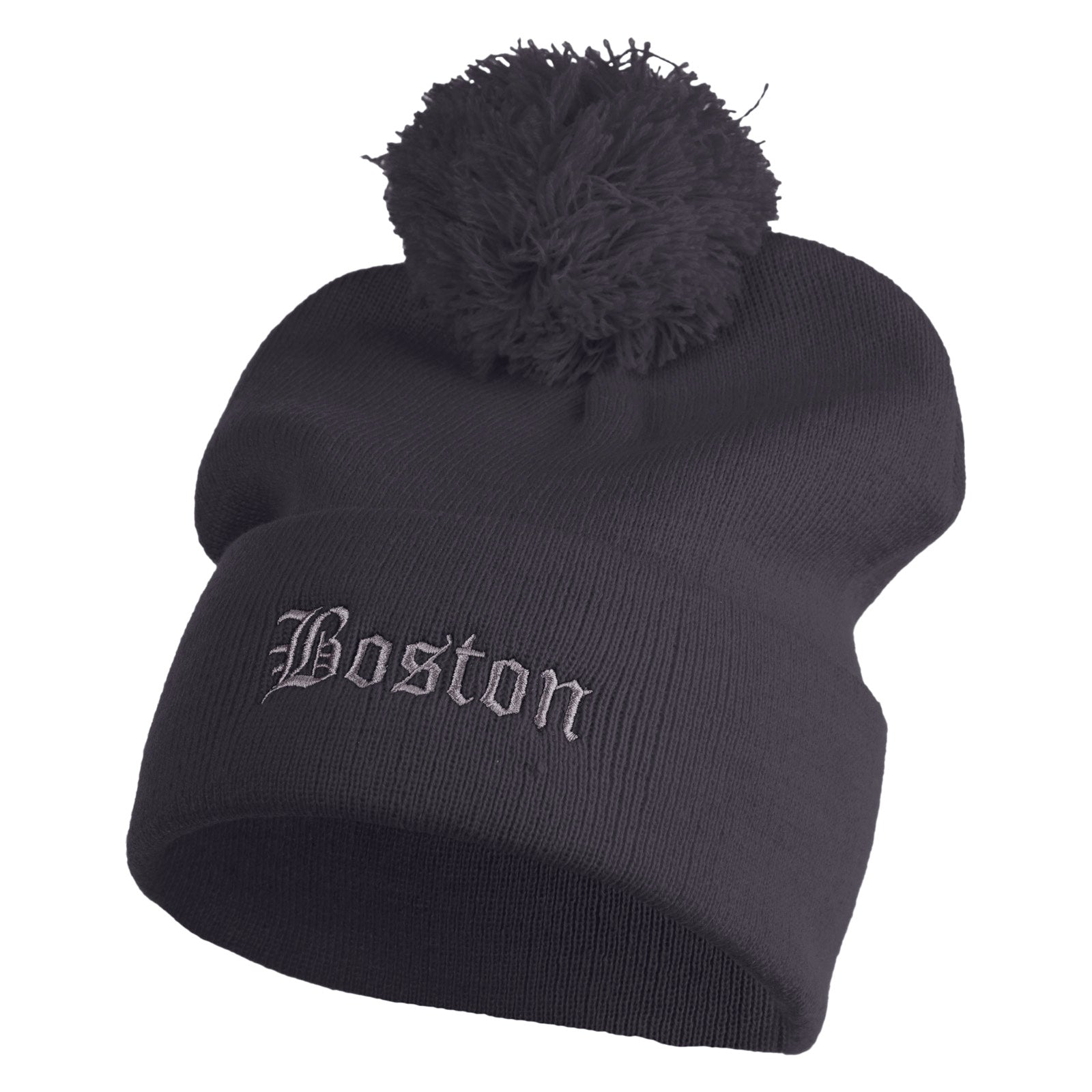 Title, Old English Boston Embroidered Pom Acrylic Cuff Long Beanie