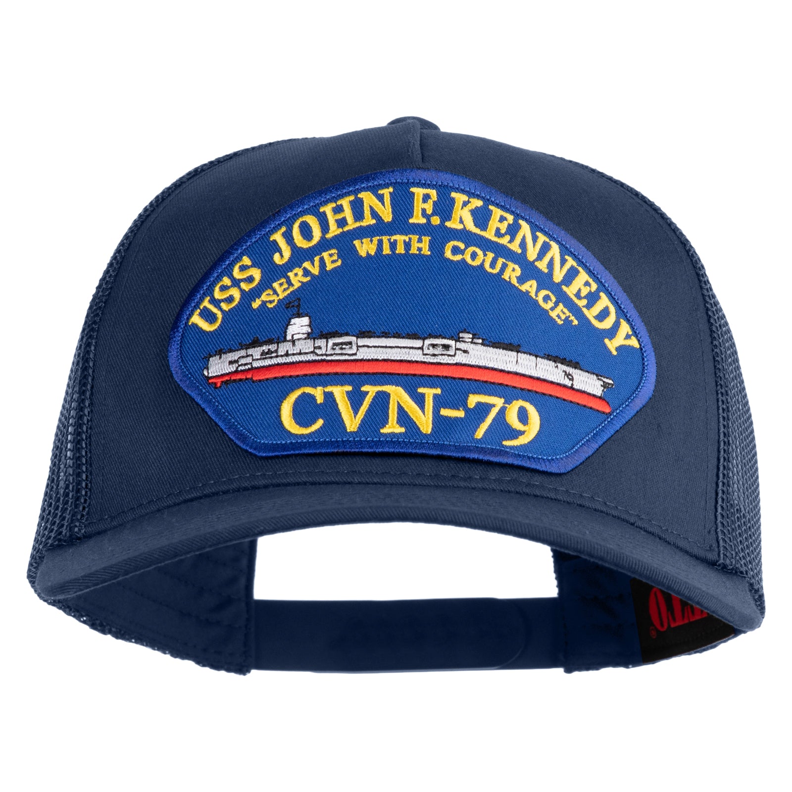 Title, USS John F. Kennedy Serve with Courage CVN 79 Blue Patched Solid Cotton Twill 5 Panel Mesh Back Cap