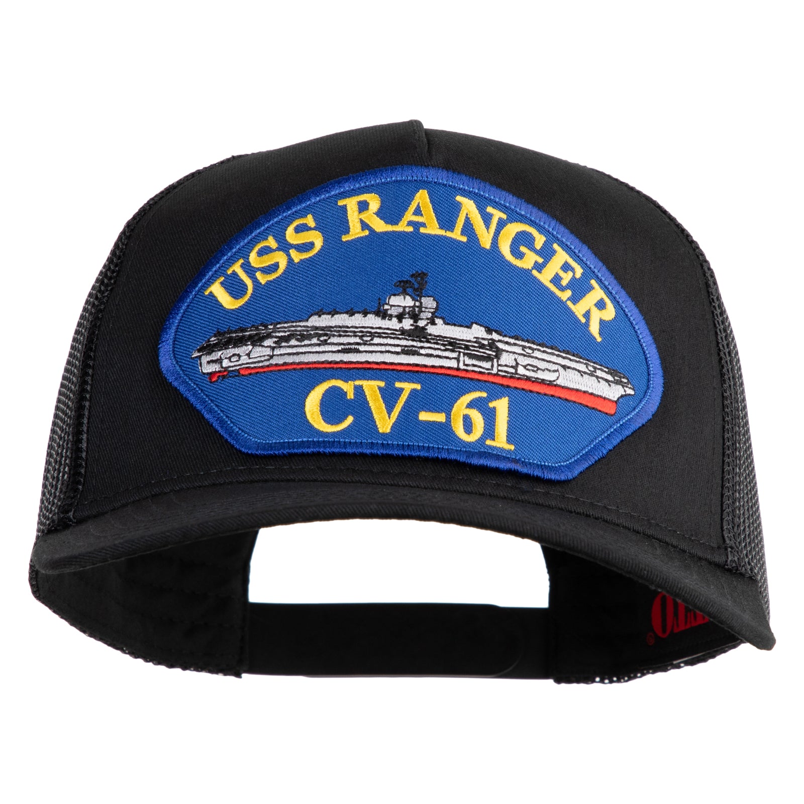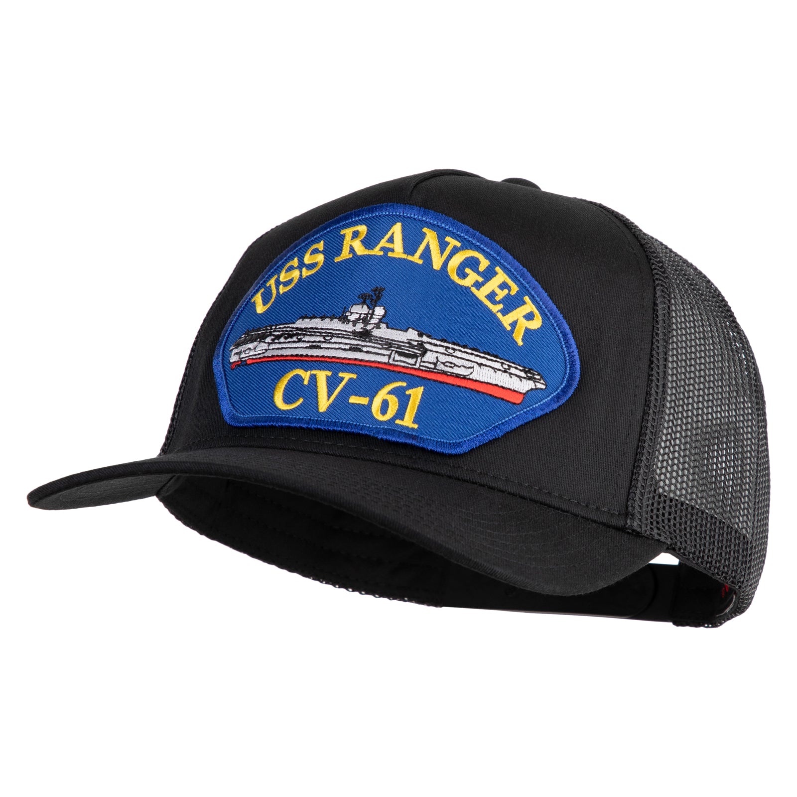 USS Ranger CV 61 Blue Patched Solid Cotton Twill 5 panel Mesh Back Cap - Black OSFM