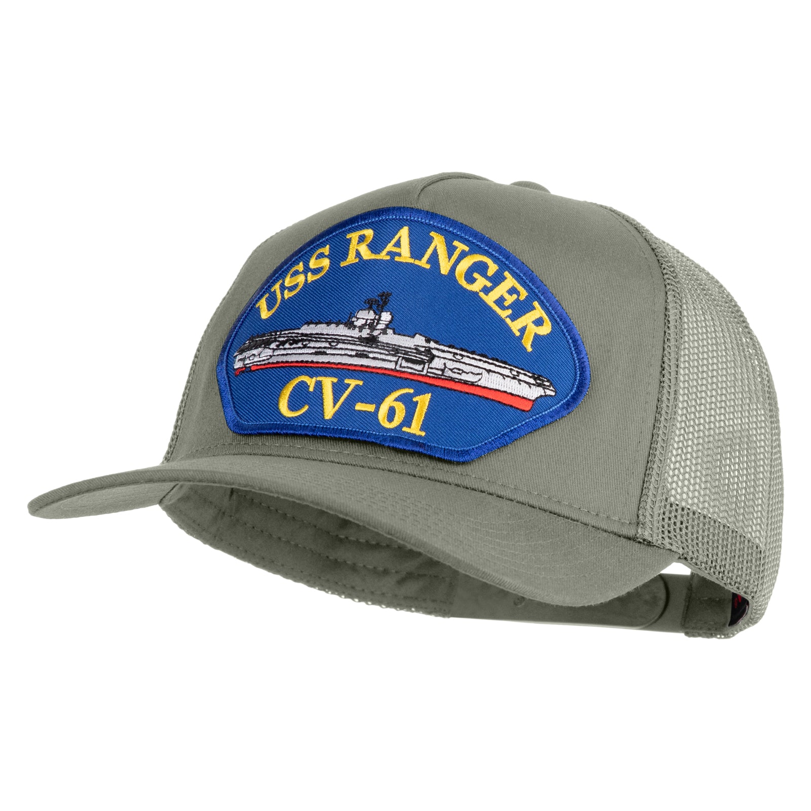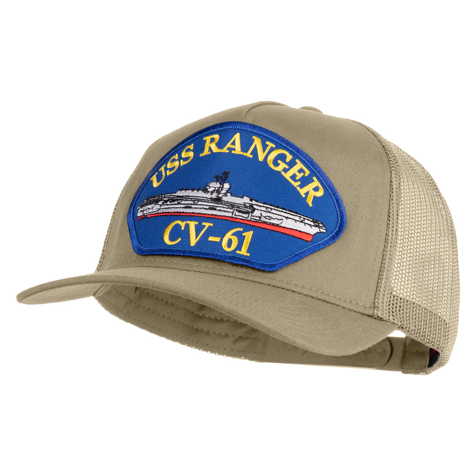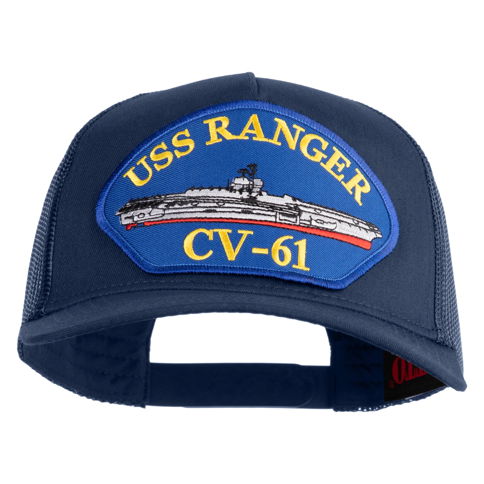 Title, USS Ranger CV 61 Blue Patched Solid Cotton Twill 5 Panel Mesh Back Cap