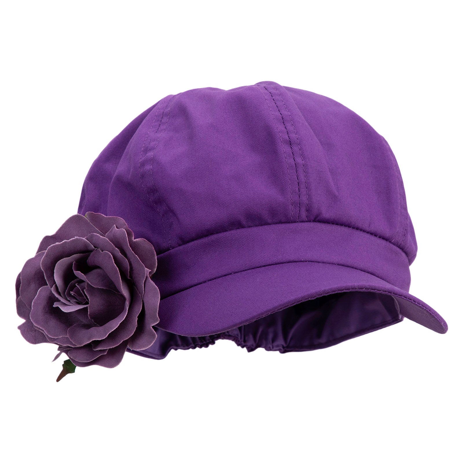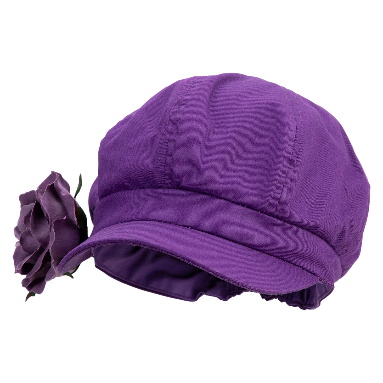 Design, Solid color newsboy hat with flower and rhinestone detail