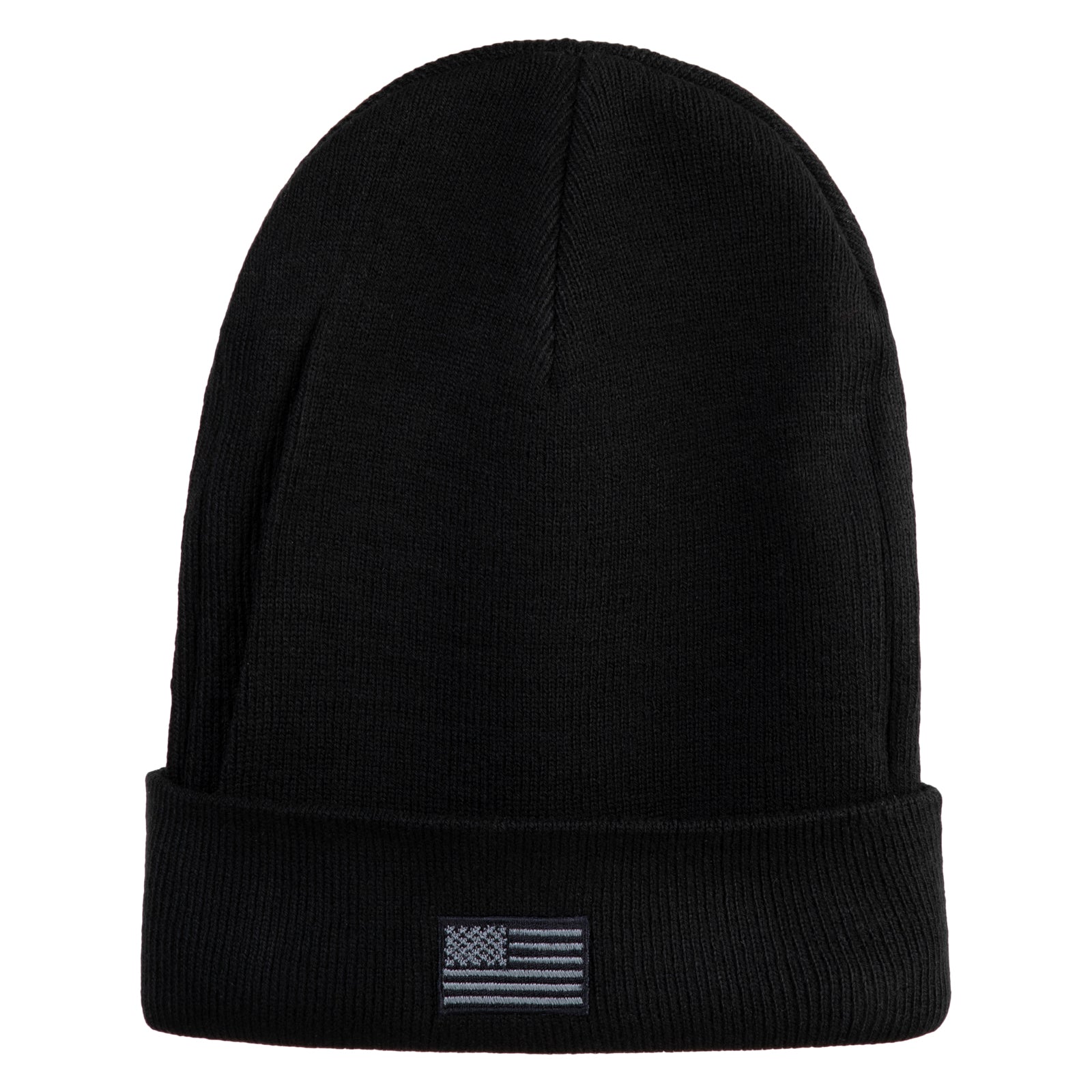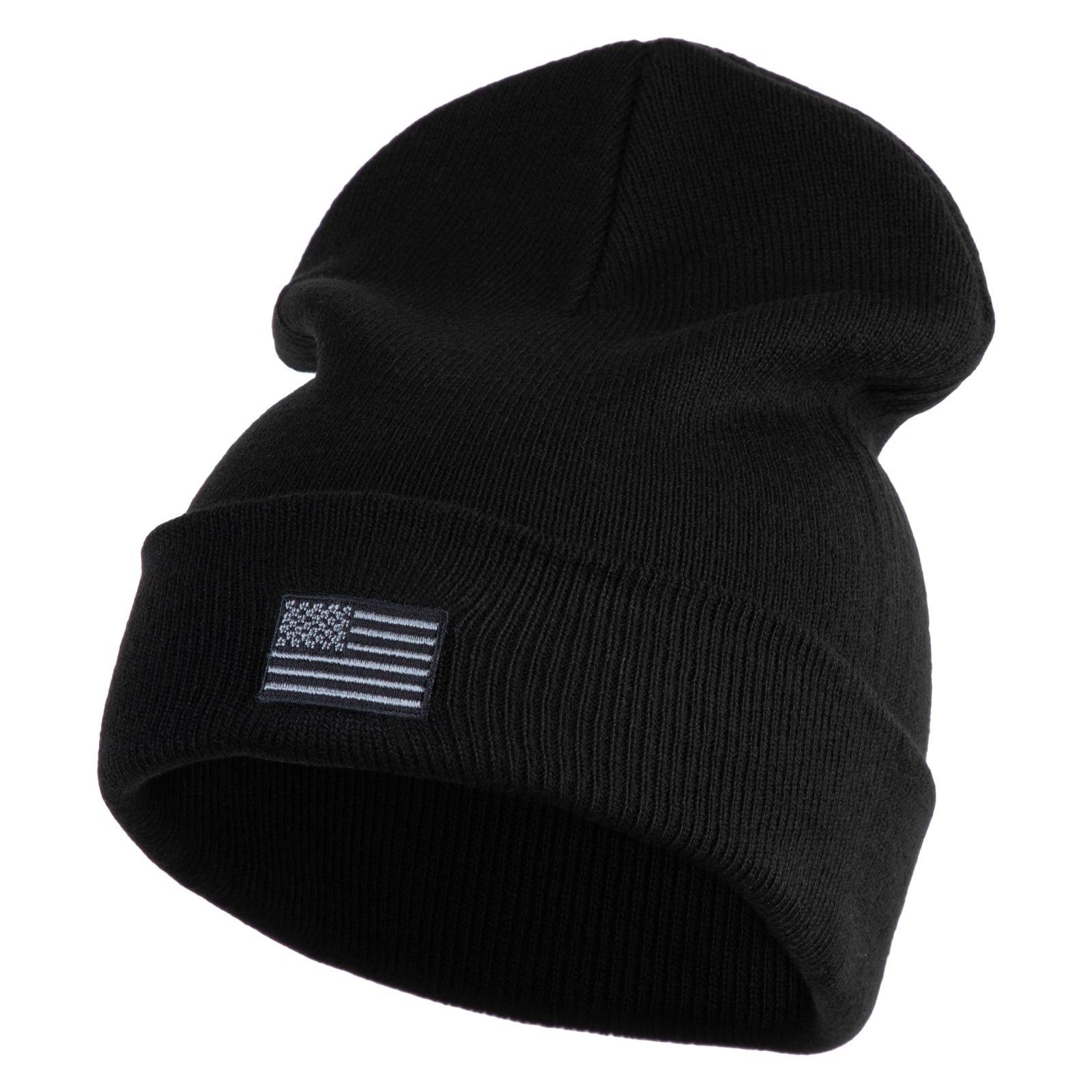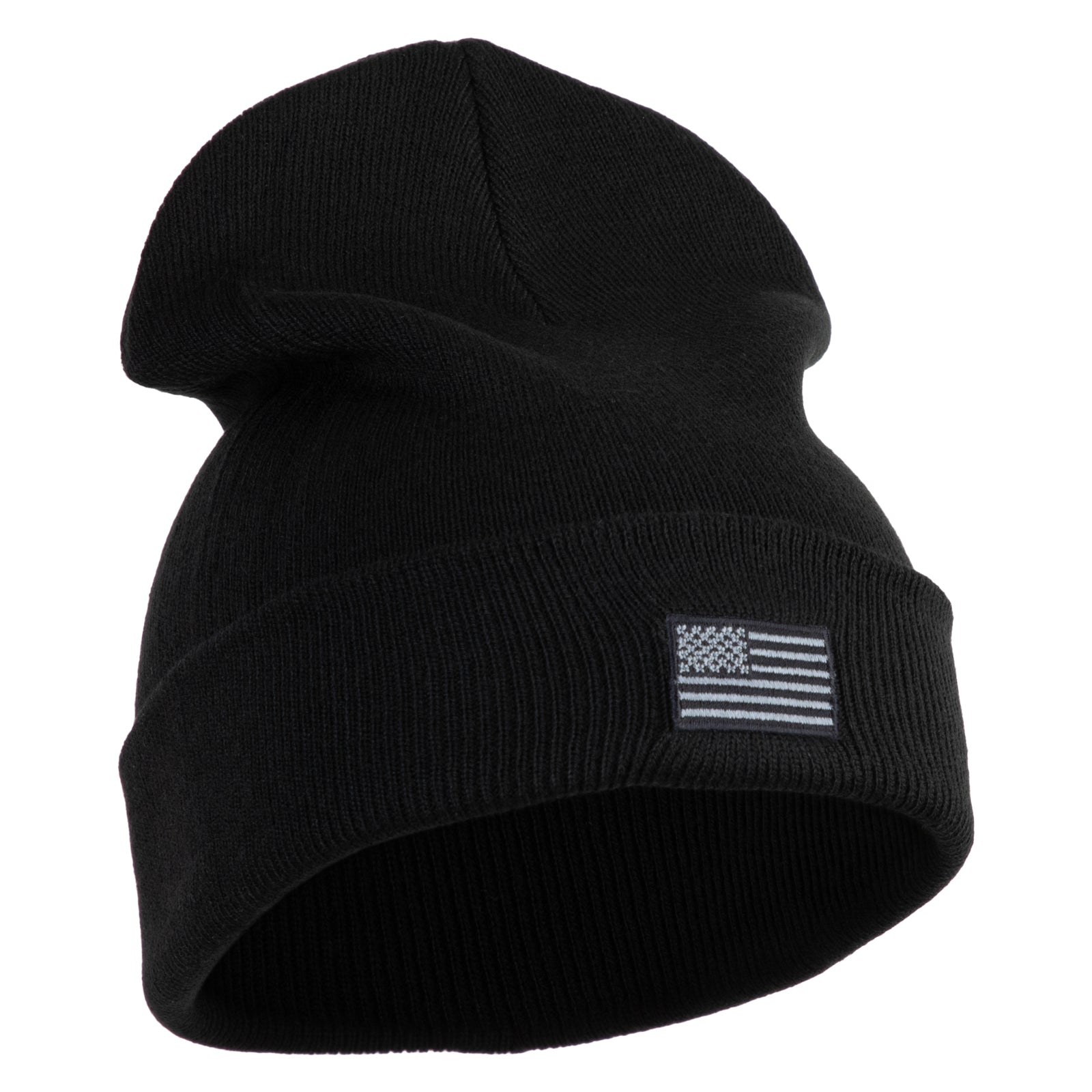 Small Patriotic Grey American Flag Iron on Embroidered Patched 12 Inch Long Knitted Beanie - Black OSFM